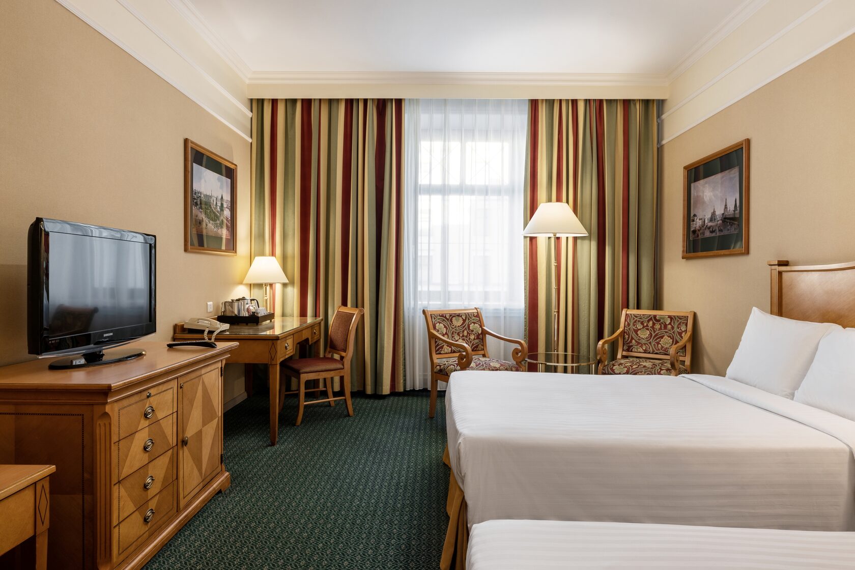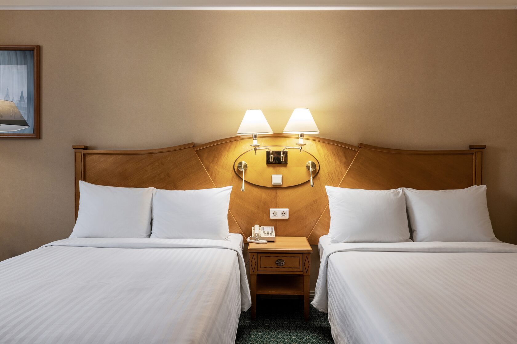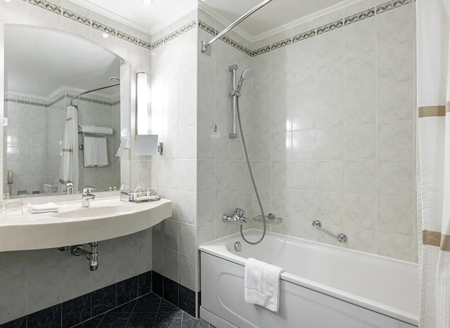 Однокомнатный номер в классическом стиле с двумя односпальными кроватями. В комплектации кондиционер, телевизор, сейф, письменный стол. Ванная комната с ванной, феном и туалетно-косметическими принадлежностями. К услугам гостей Wi-Fi, халаты, тапочки, чайный набор, утюг и гладильная доска.