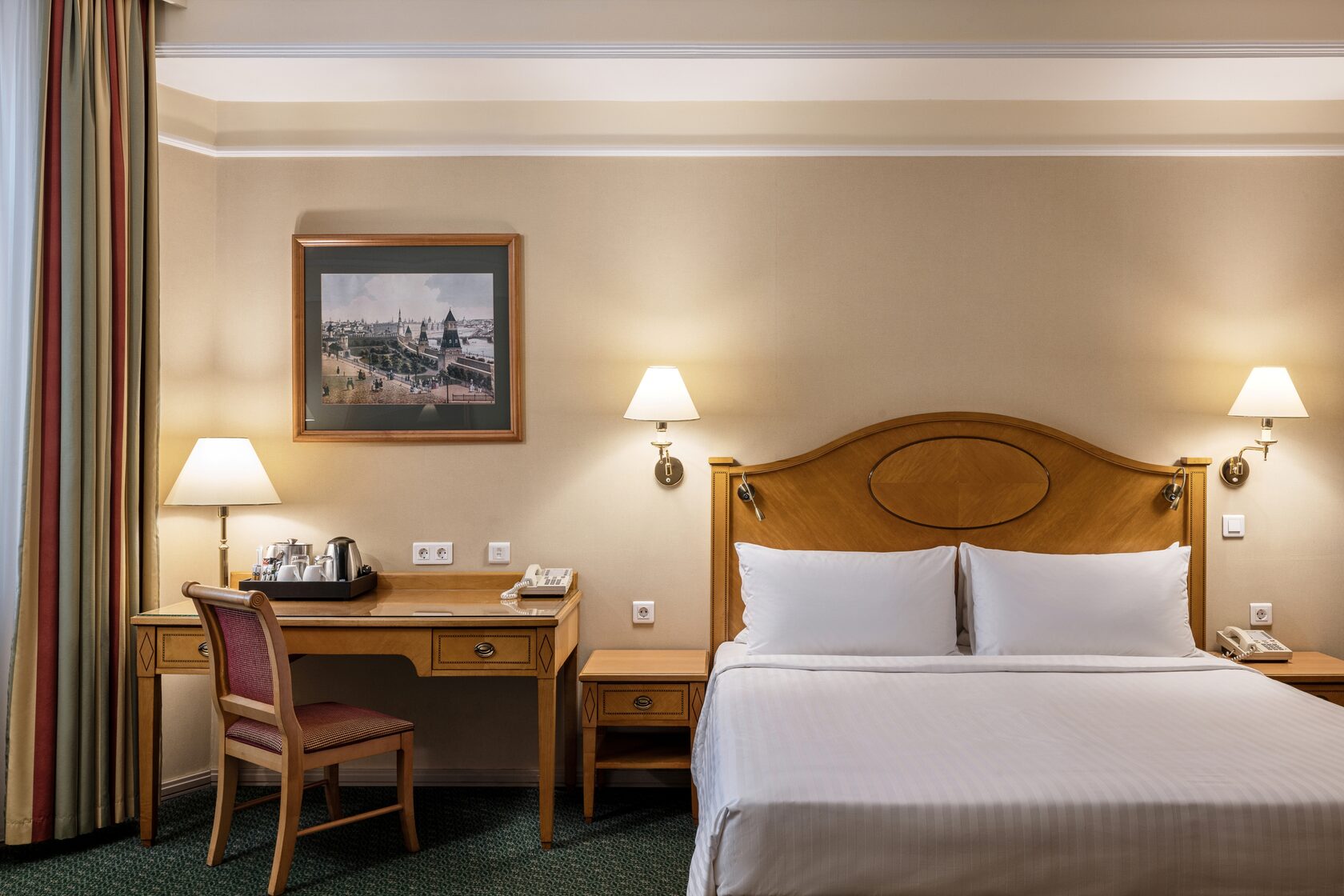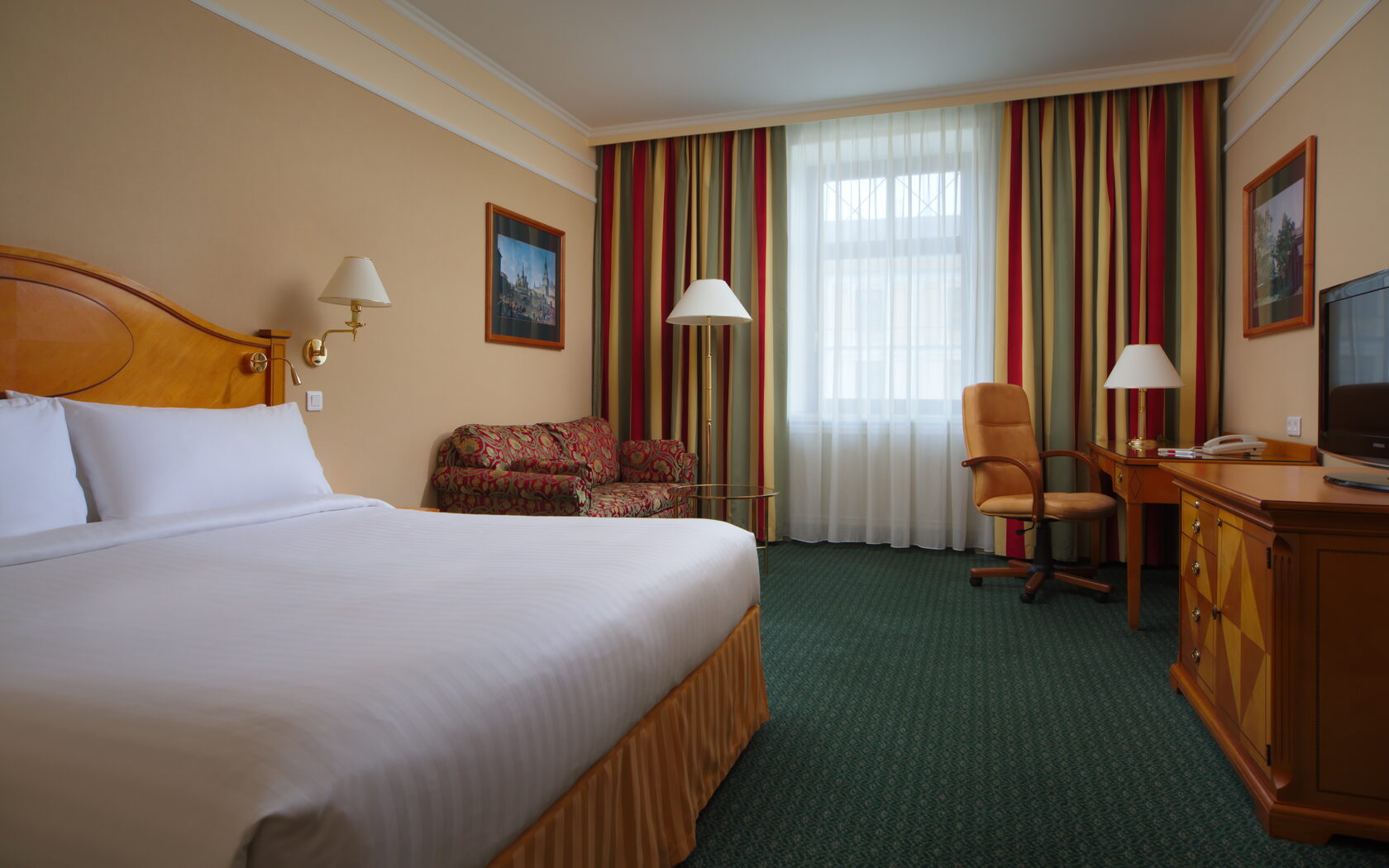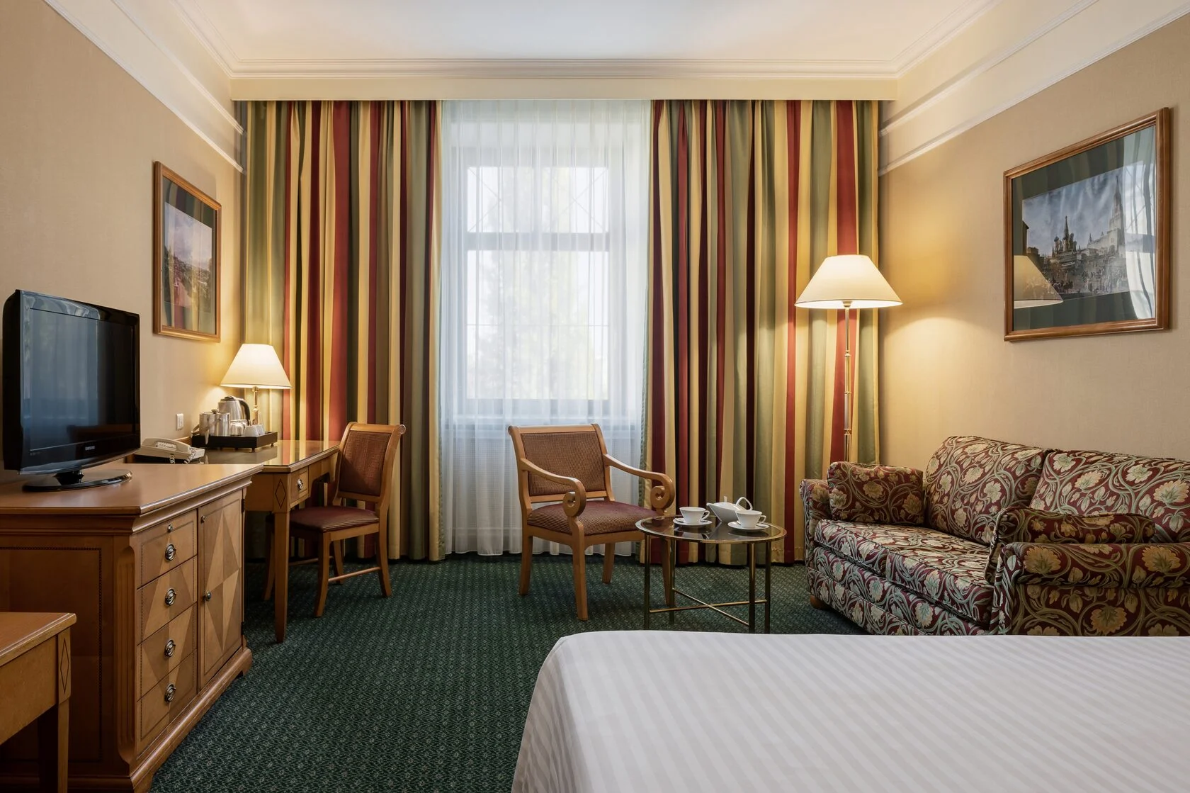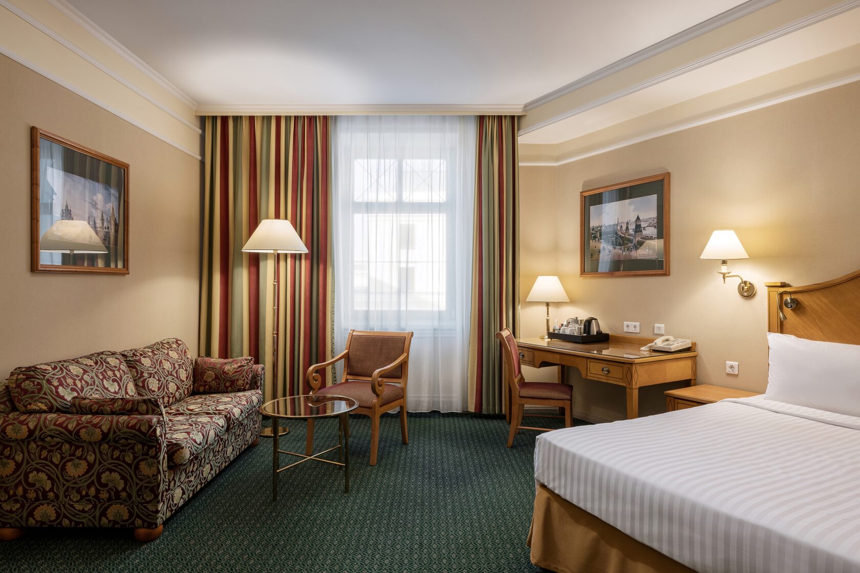 Комфортный номер в классическом стиле. Оснащен двуспальной кроватью, диваном, письменным столом. Ванная комната оборудована ванной, феном, предоставляются косметические наборы, халаты и тапочки. Среди прочих удобств кондиционер, телевизор, набор для приготовления чая и кофе, мини-бар, гладильные принадлежности.